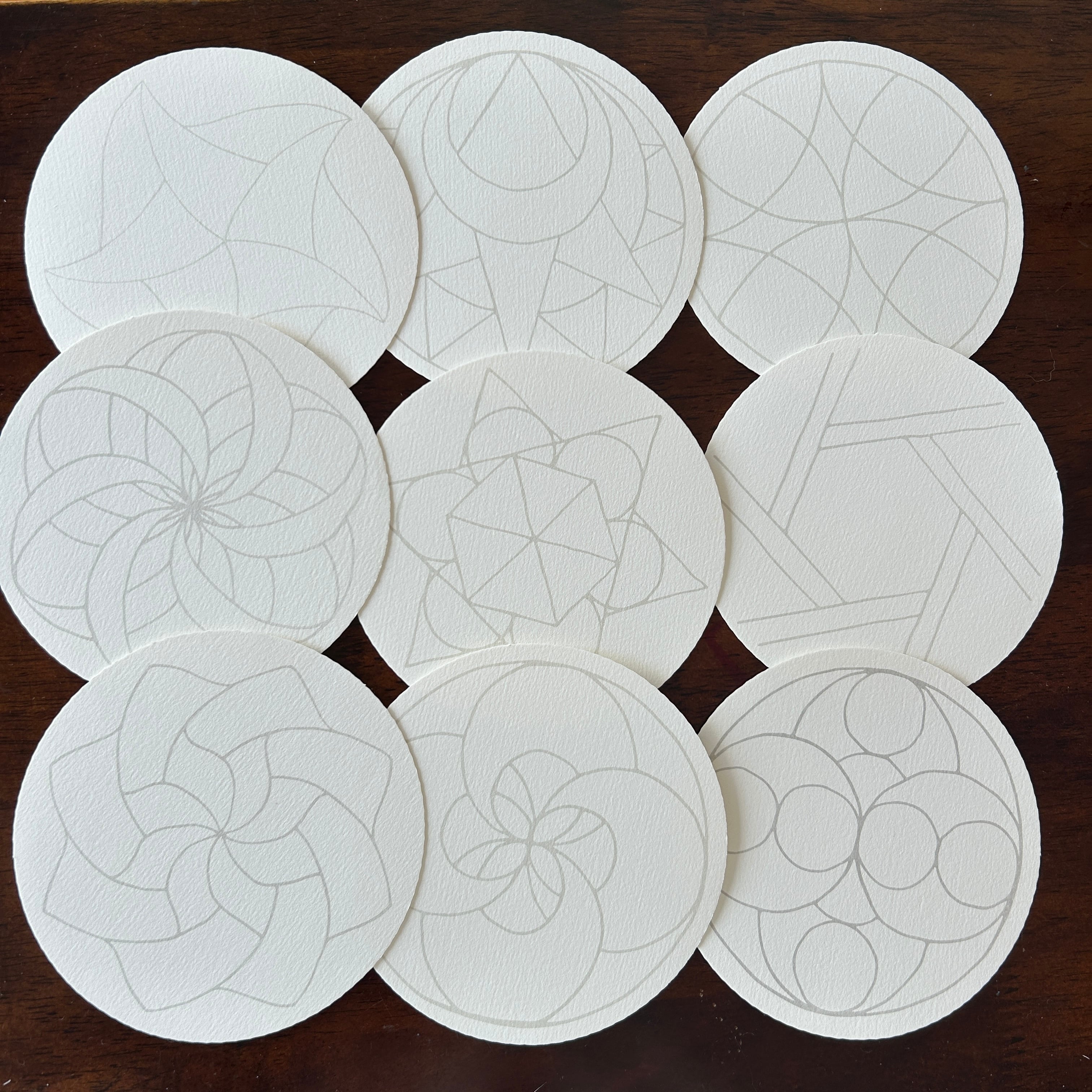 ゼンタングル社より販売されているプレストリング(うっすらとストリングが印刷されている)ゼンダラ。こちらは2025年に新発売となった9種類のゼンダラです。それぞれ一枚ずつをセットにしました。9枚全てのストリングが違うので、毎回違う楽しみ方ができます。