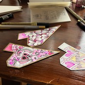 In the tutorial videos, Shie uses a black pen, white pen, gold pen, and pink and red ink.